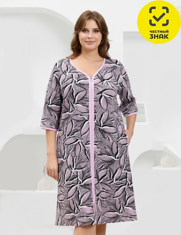 Халат женский из трикотажного полотна «кулирка» с набивным рисунком, прямого силуэта, с короткими втачными рукавами, горловиной овальной формы, карманами в боковых швах и центральной бортовой застежкой на тесьму «молния». Бортовые срезы, горловина и входы в карманы окантованы контрастным материалом.¶Поделись товаром в соц. сетях:
