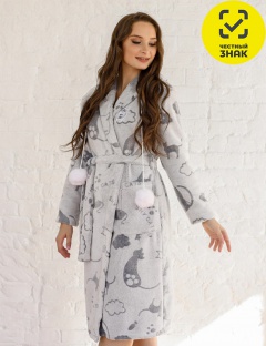 Халат запашной с «3Д» рисунком «косы», с поясом, длиной ниже колена, с капюшоном с ушками, двумя накладными карманами, длинным втачным рукавом. На левой полочке тематическая вышивка, шнур с помпонами. Низ изделия обработан швом «вподгибку».