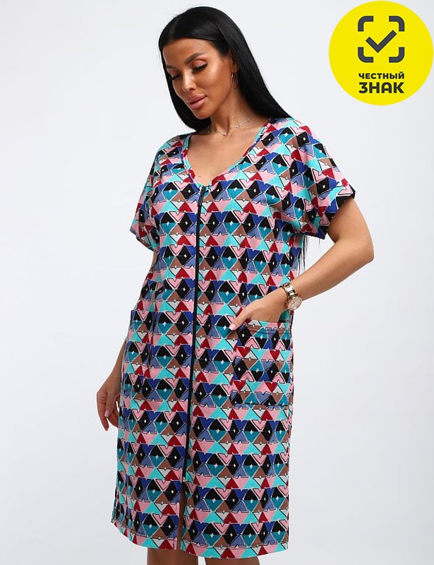 Халат женский из набивной кулирки с короткими втачными рукавами, V-образным вырезом горловины, переходящим в центральную застежку на молнию. Накладные карманы на полочках.