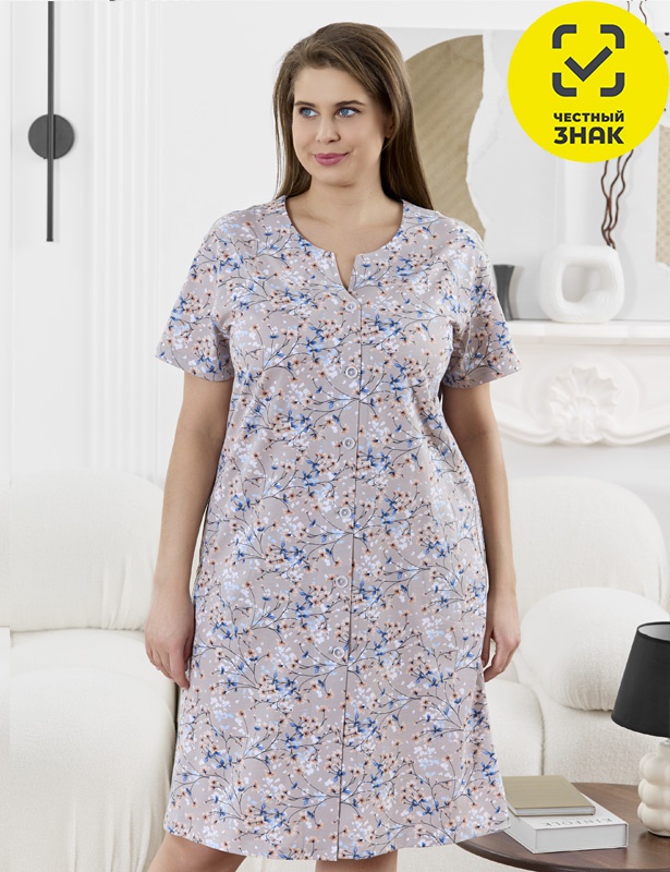 Халат женский из трикотажного полотна «кулирка» с набивным рисунком, прямого силуэта, с короткими втачными рукавами, карманами в боковых швах и центральной бортовой застежкой на обметанные петли и пуговицы. Горловина – овальной формы, переходящая в небольшой v-образный вырез выше верхней пуговицы. Входы в карманы и горловина спинки окантованы.