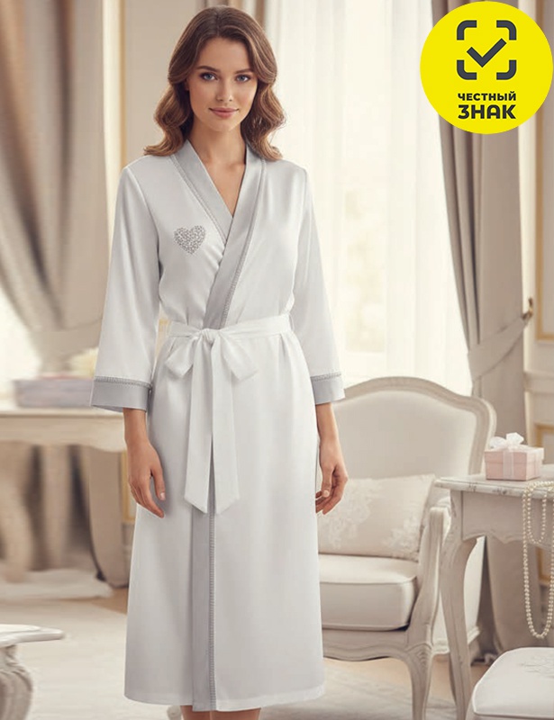 Элегантный халат на поясе с длинным рукавом. Лаконичный крой дополнен контрастной отделкой и изящной вышивкой в виде сердца. Идеален для утреннего и вечернего отдыха.