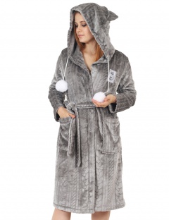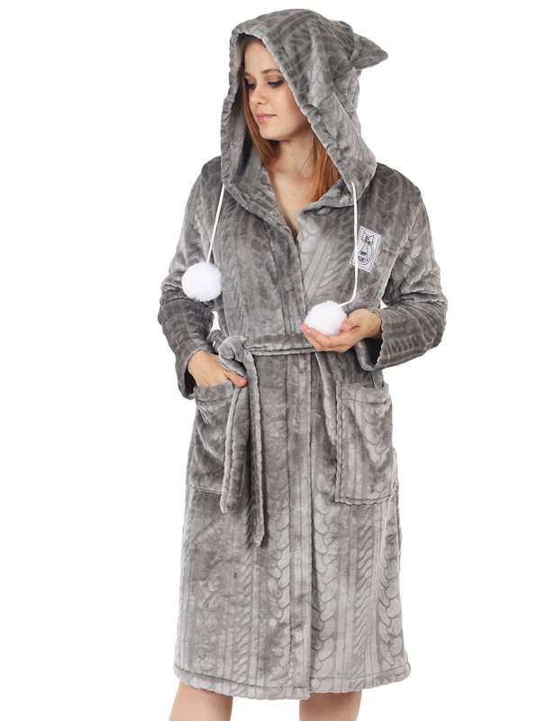 Халат запашной с «3Д» рисунком «косы», с поясом, длиной ниже колена, с капюшоном с ушками, двумя накладными карманами, длинным втачным рукавом. На левой полочке тематическая вышивка, шнур с помпонами. Низ изделия обработан швом «вподгибку».