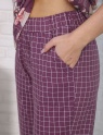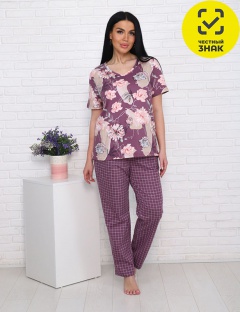 Костюм с брюками из кулирки набивной, ткани-компаньоны. Футболка с втачным рукавом, V-образный вырез по горловине. Брюки прямые с поясом и карманами.