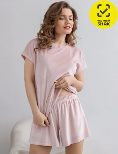 Костюм молодежный из трикотажного полотна «велюр-стрейч», состоящий из футболки и шорт. Футболка – классического кроя, с короткими цельнокроеными рукавами и горловиной овальной формы, обработанной втачной планкой. Шорты - средней длины, расширенные книзу, с эластичной тесьмой по талии.