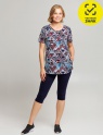 Костюм женский из двух предметов: блуза выполнена из стильного набивного трикотажного полотна, прямого силуэта, с округлой горловиной, короткими втачными рукавами, с двумя боковыми карманами. Бриджи однотонные прилегающего силуэта, длиной ниже колена.