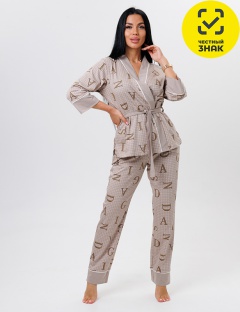 Домашний костюм из кулирки состоит из брюк и туники на запах с поясом. Обтачка туники, низ рукавов и низ брюк выполнены из полотна контрастного цвета с отделкой кантом.
