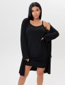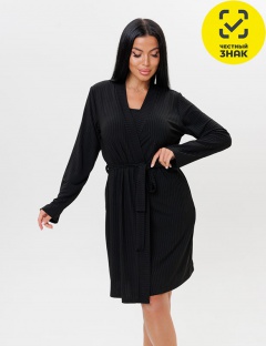 Домашний комплект из трикотажного полотна «лапша» включает два предмета: сорочку и халат. Сорочка прямого кроя на тонких бретелях, а халат запащной и на поясе, его длина выше колена.