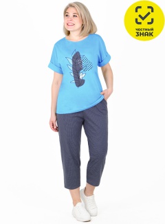 Костюм из мягкого нежного хлопка со спущенным коротким рукавом и округлой формы горловины. Низ изделия обработан швом в подгибку. Капри изготовлены из ткани с рисунком, с карманами и цельнокроеным поясом на удобной резинке.