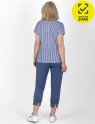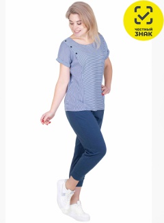 Костюм женский состоит из футболки и бридж. Футболка из набивного полотна, с короткими рукавами с отворотами, на полочке рельефы декорированы тремя пуговицами, округлая горловина окантована бейкой из основного полотна. Бриджи облегающие, с манжетами по нижним срезам, на поясе на резинке, карманы по бокам.