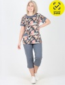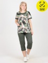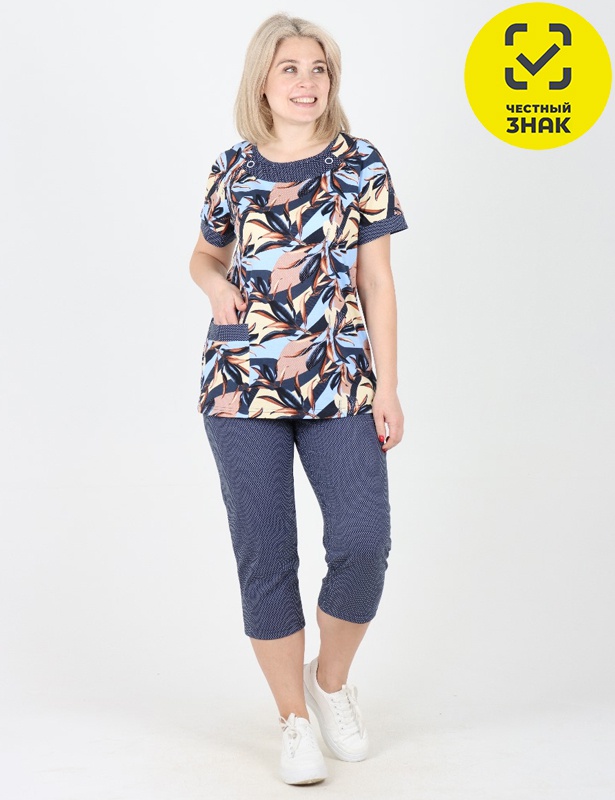 Стильный женский костюм для дома и отдыха, выполненный из мягкого хлопкового трикотажа. Комплект включает удобные бриджи и свободную блузу с короткими рукавами и двумя вместительными карманами.