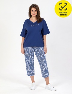 Костюм женский из трикотажного полотна «кулирка» в комбинации двух видов в единой цветовой гамме: гладкокрашеный и с набивным рисунком, состоящий из футболки и брюк. Футболка - из гладкокрашеного трикотажного полотна «кулирка» классического покроя, с втачными рукавами длиной до локтя, горловиной V-образной формы, обработанной втачной планкой и принтом на полочке. Брюки – из полотна с набивным рисунком, длинные, свободные, на притачном поясе с эластичной тесьмой внутри, с карманами в боковых швах.