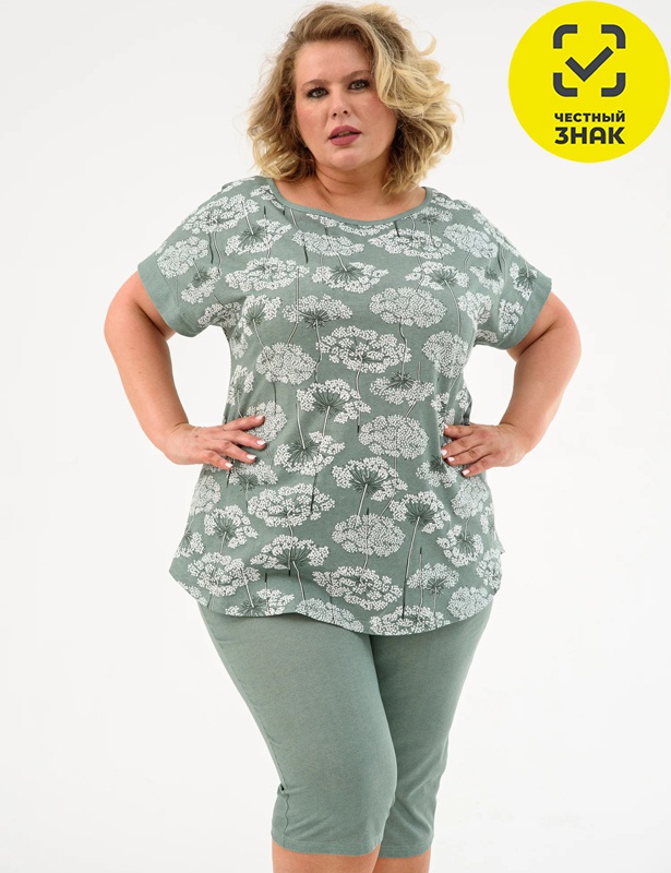 Производитель: ТМ Оптима Трикотаж Артикул: 2202-К Костюм женский Луговые цветы (зеленый) Пол: ЖЕНСКИЙ Полотно: кулирная гладь Состав: хлопок 100% Возраст: взросл