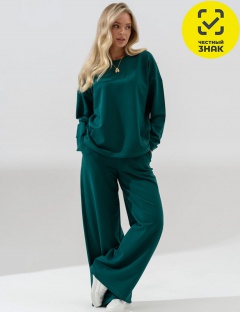 Костюм женский "Палаццо", состоящий из джемпера и брюк, выполнен из футера без начеса. Джемпер свободного кроя, с длинными рукавами и округлой горловиной. Брюки палаццо с высокой посадкой и широкими штанинами.