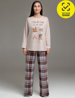 Комплект женский из кулирки, состоит из джемпера и брюк. Джемпер с длинным рукавом, спущенное плечо, на полочке печать. Брюки длинные, свободные, с карманами и резинкой на поясе.