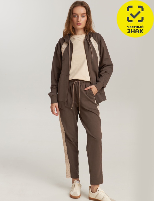 Спортивный костюм женский из мягкого трикотажа. Худи с капюшоном и молнией украшено объёмной фактурной ажурной вставкой  — от плеча до груди. Такие же вставки проходят вдоль боковых швов на брюках, создавая эффектный контраст и подчёркивая силуэт.
