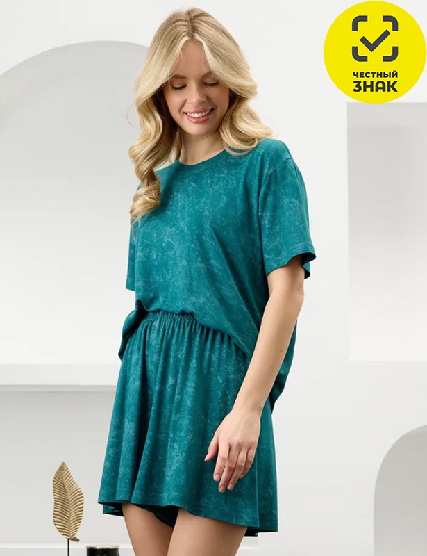 Костюм женский в комбинации двух видов полотен: из гладкокрашенного трикотажного вискозного полотна с эффектом «варенка», состоящий из футболки и шорт. Футболка - классического покроя, с короткими втачными рукавами, горловиной овальной формы, обработанной втачной планкой.Шорты – свободные, средней длины, с эластичной тесьмой по талии.