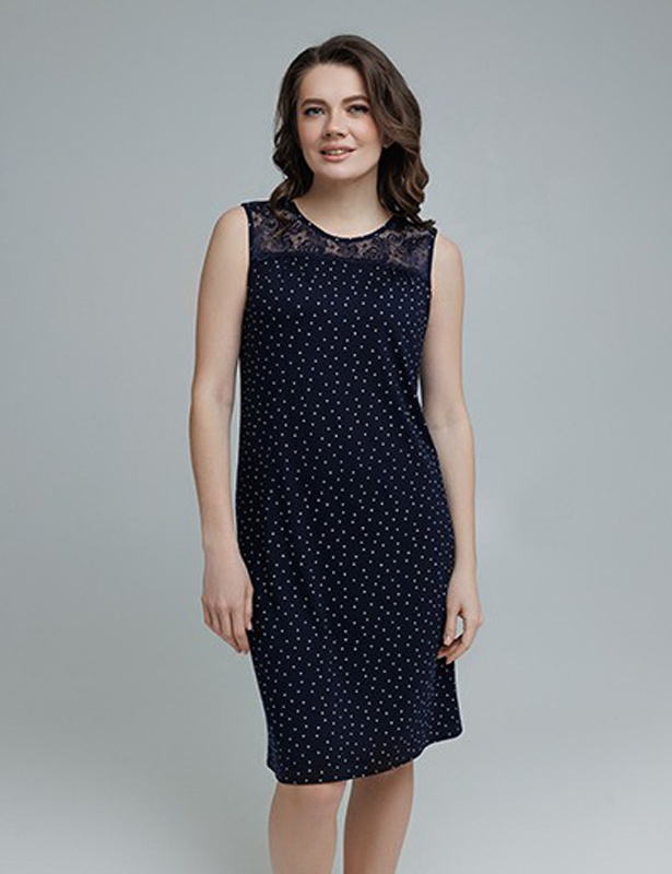 Сорочка женская из набивной вискозы, без рукавов, с широким плечом, округлый вырез горловины, кокетка со сборкой и декорирована кружевом.