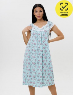 Ночная сорочка свободного кроя выполнена из кулирки со 100% хлопком. Круглый вырез декорирован кружевом. Кокетка по линии груди отделана кружевом и дополнена складками.