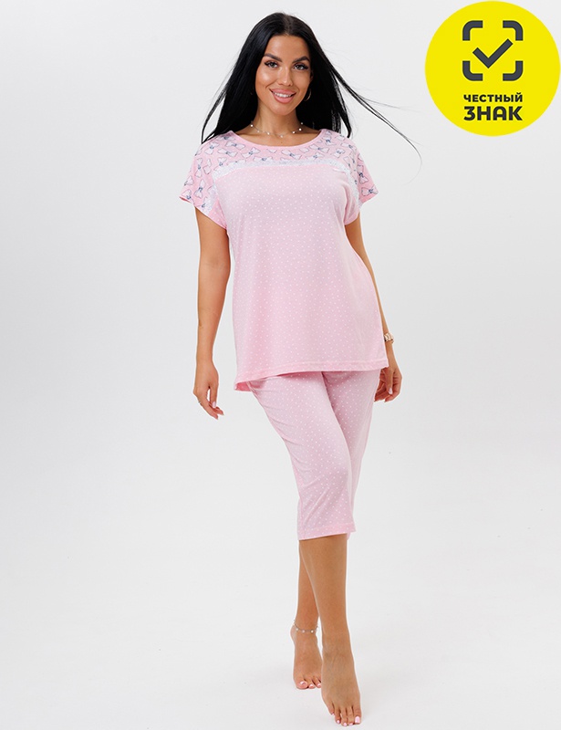 Пижама сшита из трикотажного полотна кулирки. Она состоит из футболки и бридж. Футболка с круглым вырезом. На груди, кокетка из ткани компаньона с кружевом. Рукав спущенный короткий цельнокроеный. Бриджи на резинке.