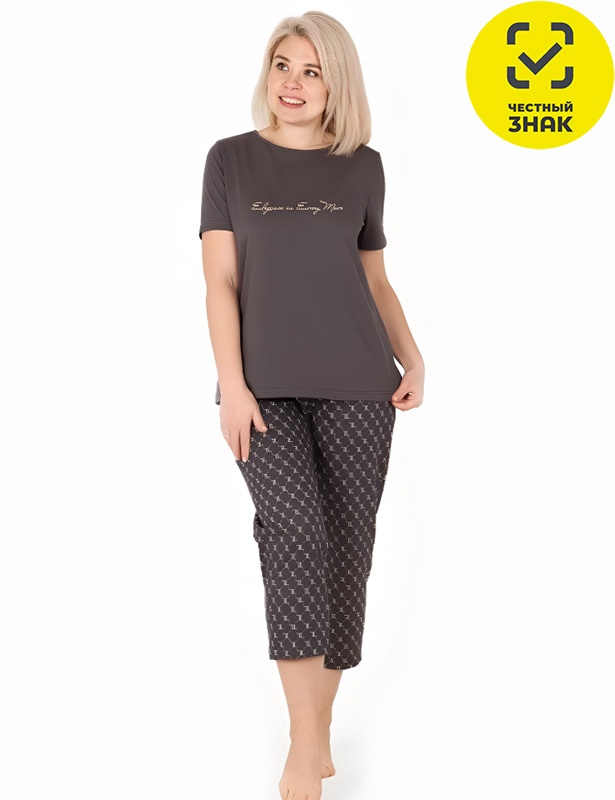 Пижама состоит из футболки и бриджей, из нежного хлопчатобумажного полотна. Горловина изделия круглой формы, рукава короткие втачные. Свободные бриджи из набивной ткани фиксируются на бедрах удобной резинкой, которая не стесняет движения. Крупный принт на полочке в виде надписи создает современный образ для сна и отдыха.