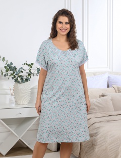 Сорочка женская из трикотажного полотна «кулирка» с набивным свободного покроя, расширенная книзу, с короткими цельнокроеными рукавами, горловиной овальной формы, окантованной основным материалом и четырьмя застроченными складочками-защипами, выходящими из горловины полочки. Отделка – полоски узкого кружева, настроченные параллельно складкам-защипам.
