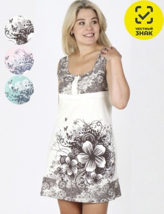 Сорочка из мягкого хлопка, на удобной широкой бретели, длина выше колена. Однотонное полотно дополнено кокеткой из набивной ткани спокойных приятных оттенков. Вертикальная декоративная планка на груди украшена тремя атласными бантиками. На нижней части полочки расположен нежный принт цветочной тематики, который делает образ более утонченным и романтичным.