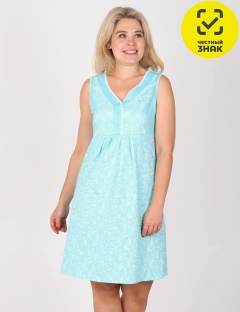 Сорочка из мягкого кулирного полотна, на широкой бретели, длина выше колена. Светлые пастельные тона полотен с цветочным рисунком гармонично сочетаются с однотонной кокеткой, дополненной нежным симметричным рисунком, напоминающим морозные узоры. На груди расположена удобная планка на трех серебристых кнопках, вдоль которой проходит тонкое белое кружево.