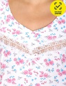 Набивные полотна преимущественно мягкой цветочной тематики нежно дополняет белое тонкое кружево вдоль горловины.