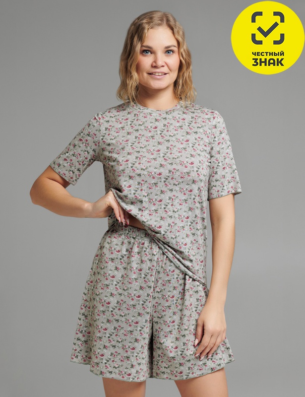 Женская пижама, состоящая из футболки и шорт, изготовлена из вискозы. Футболка прямого кроя с короткими рукавами и округлым вырезом горловины. Шорты свободного кроя с эластичной резинкой на поясе. Пижама идеально подходит для отдыха и сна.