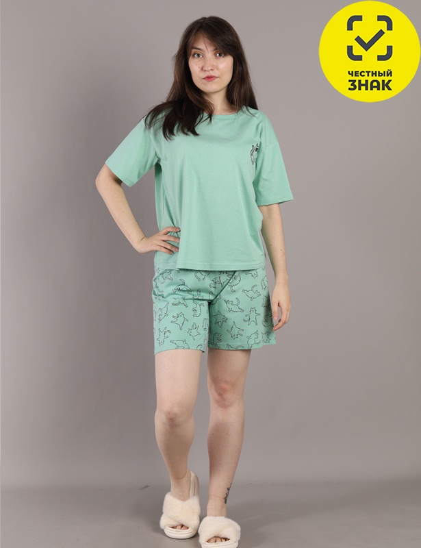 Пижама женская: футболка и шорты из мягкого трикотажа. Футболка с коротким рукавом. Горловина круглая, из рибаны. На полочке выполнена шелкография. Шорты с поясом на резинке.