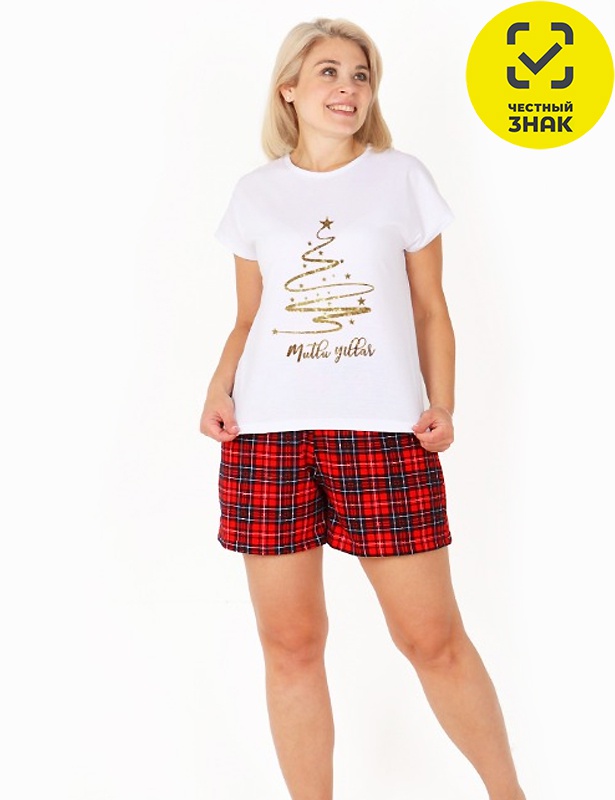 Легкая хлопковая пижама с шортами и футболкой, дополненная принтом с новогодней тематикой.