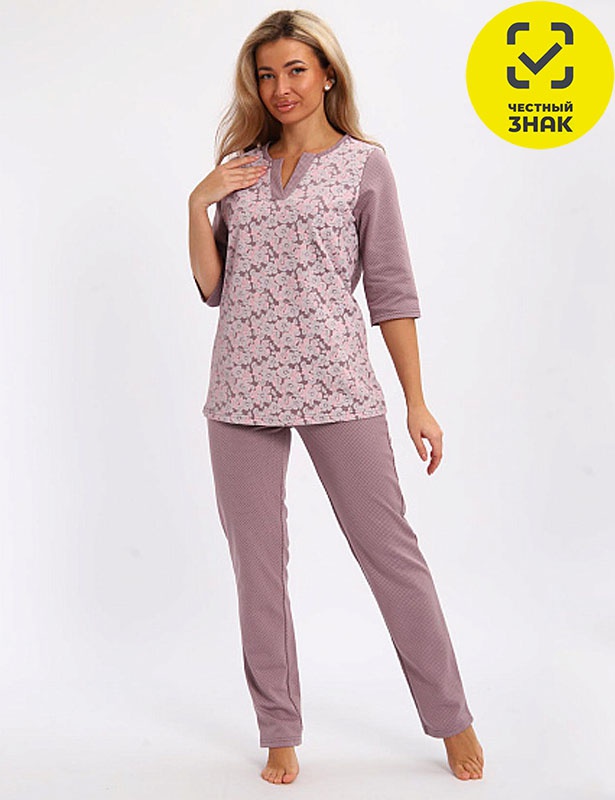 Пижама женская из футера с начесом. Джемпер с V-вырезом горловины с планкой, рукав 3/4. Брюки на резинке.