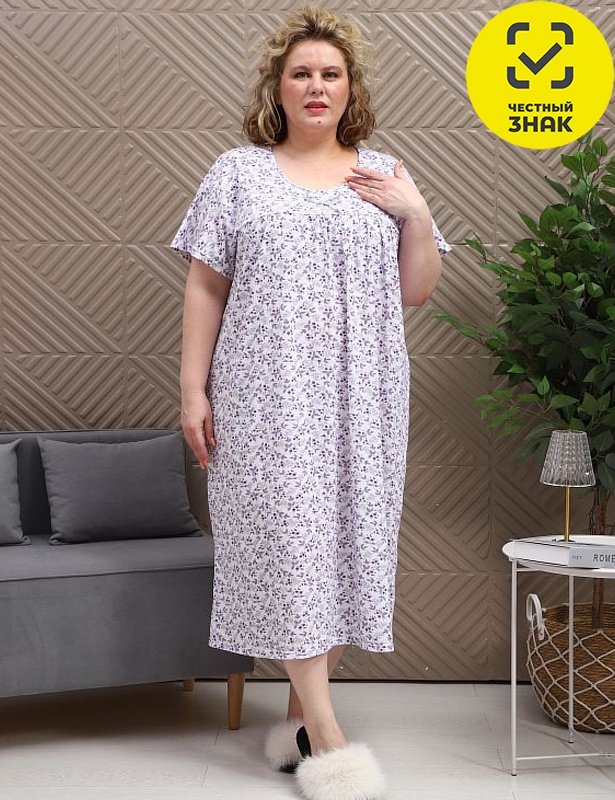 Сорочка женская из набивной кулирки, свободного покроя, с короткими втачными рукавами и горловиной овальной формы.