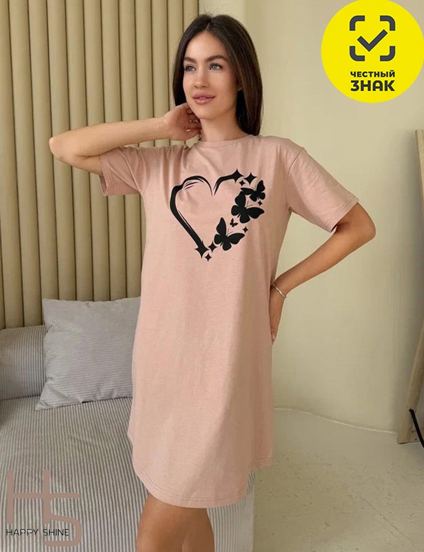 Сорочка женская с коротким рукавом. Вырез горловины круглый, обработан притачной бейкой из рибаны с эластаном. На полочке печать.