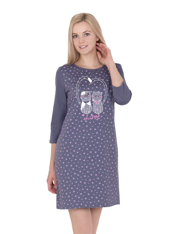 Сорочка из теплого футера, с удобным рукавом 3/4, длина немного выше колена. Набивные полотна дополняют однотонные рукава и кокетка на спинке, внизу которой расположен маленький бантик. На груди сорочку украшает логотип с изображением двух котят, которые создают нежный образ для сна.