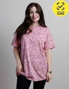Туника женская из набивного полотна, прямого силуэта, длиной ниже линии бедра. Со спущенными плечами, рукав до локтя. Круглая горловина обработана узкой притачной обтачкой из рибаны с эластаном.