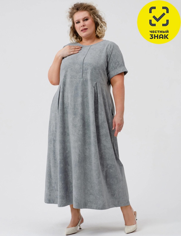 Платье свободного кроя с круглой горловиной и вертикальной декоративной планкой по центру переда. Модель отрезная по линии груди, с втачными рукавами, оформленными отворотами. Низ изделия слегка расширен. В боковых швах расположены врезные карманы. Макси-длина плавно опускается до щиколотки, создавая женственный и элегантный образ.