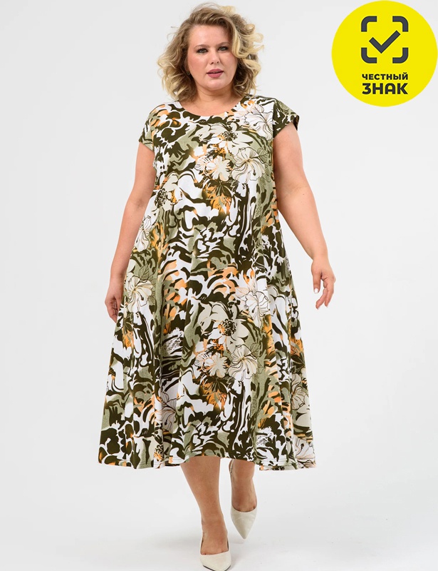 Платье свободного кроя с круглой горловиной и короткими втачными рукавами. Модель выполнена без выраженной линии талии, что обеспечивает комфортную и свободную посадку. Юбка плавно расширяется книзу, а длина миди создаёт лёгкий и женственный силуэт. Ткань украшена ярким абстрактным цветочным принтом.