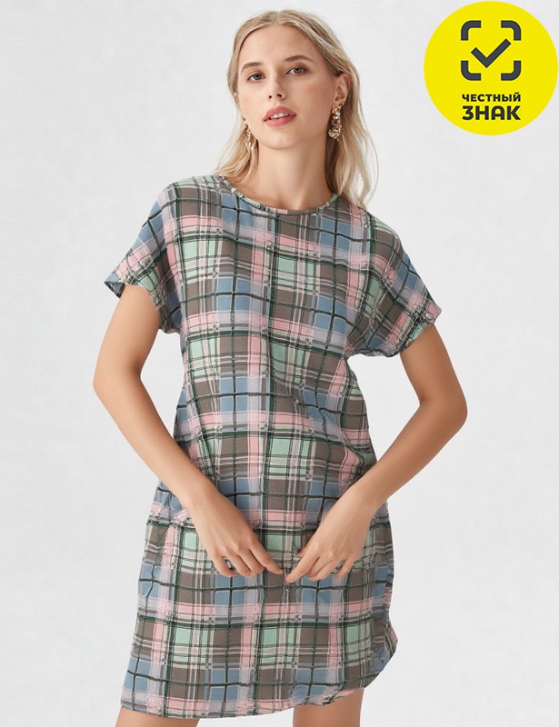 Туника женская свободного силуэта, цельнокроенные короткие рукава, округлая горловина.