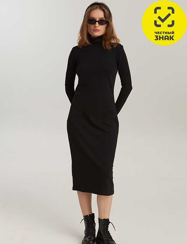 Элегантное трикотажное платье-миди из рибаны с фактурной вертикальной вязкой. Модель с длинными рукавами и высоким воротником-стойкой из основного полотна подчёркивает фигуру за счёт облегающего кроя. В нижней части предусмотрен разрез для свободы движений, украшенный золотистыми пуговицами, которые придают платью изысканный акцент.