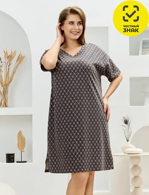 Туника женская из трикотажного полотна «кулирка» с набивным рисунком, свободного покроя, со спущенной линией плеча, втачными короткими рукавами, горловиной V-образной формы, обработанной втачной планкой и разрезами в боковых швах.