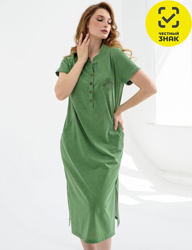 Платье женское полуприлегающего силуэта из гладкокрашеного полотна, имитирующего структуру полотна из льна. Рукав короткий втачной. Застёжка по переду на петли и пуговицы. Воротник – узкая стойка. На левой полочке вышивка. На полочке 2 боковых кармана в швах. Низ рукавов и борта изделия окантованы широкой бейкой. В боковых швах высокие разрезы. Низ изделия обработан швом в подгибку.